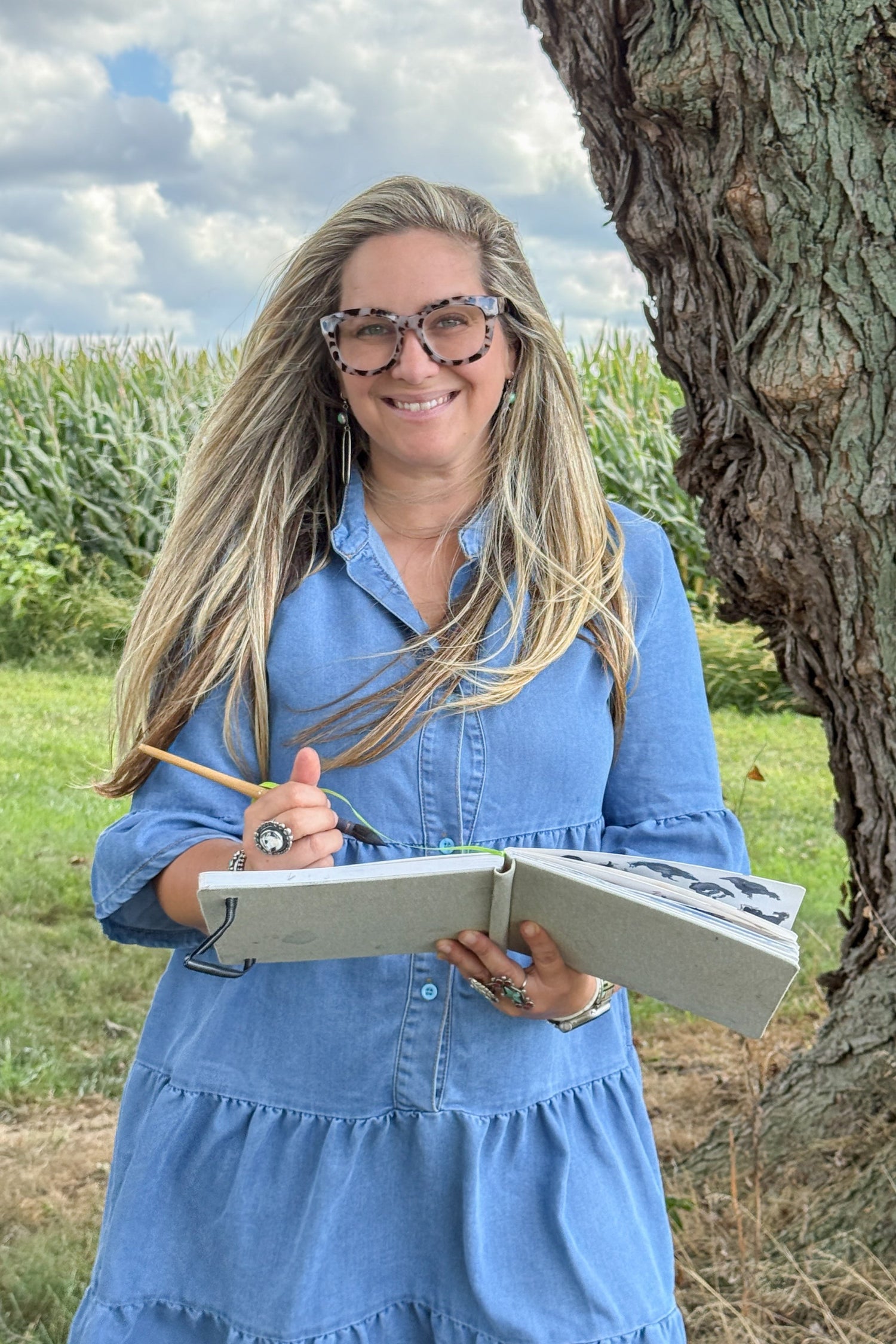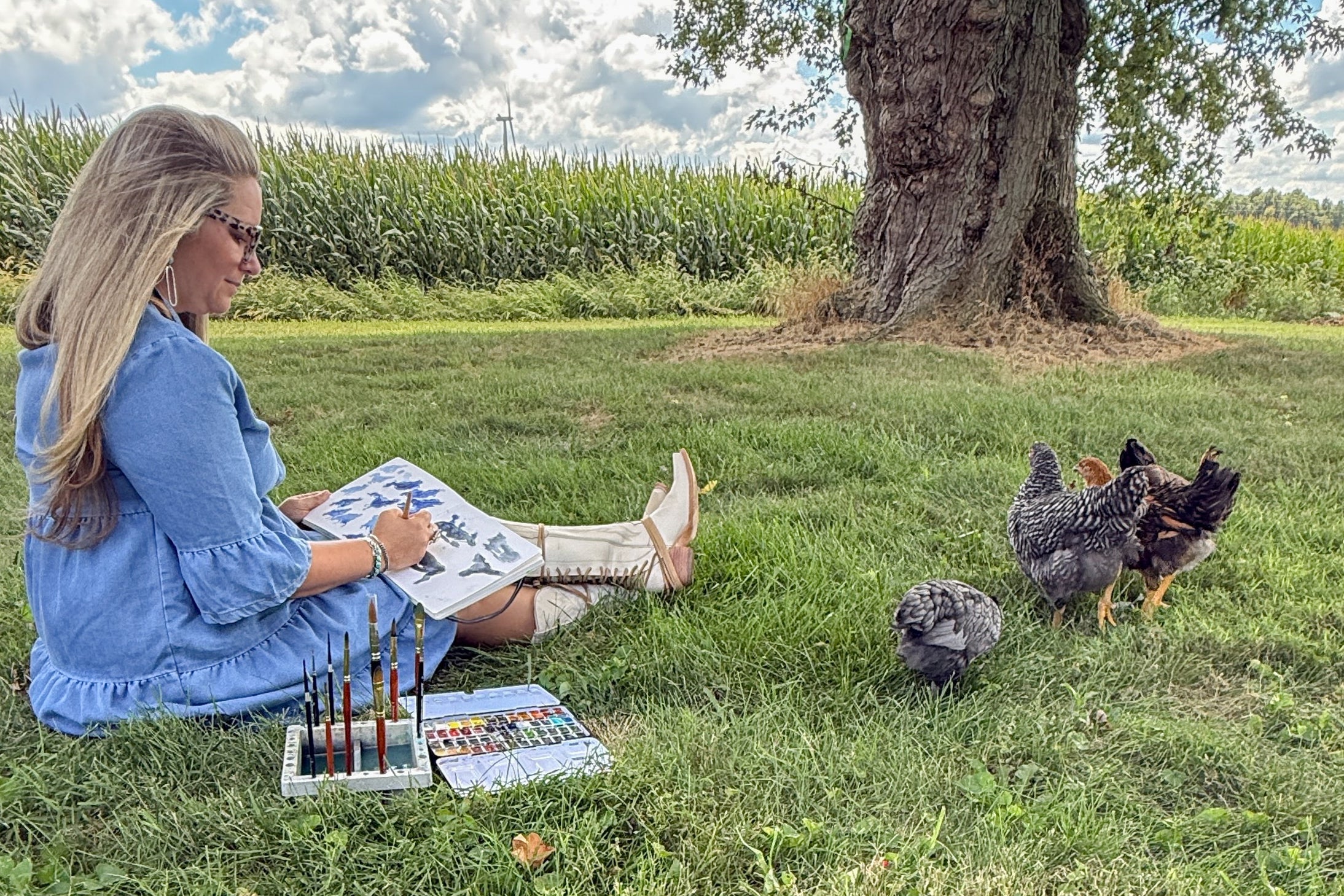 Today, Vanessa lives and works on her family’s historic Indiana farm, where she continues her exploration of place and memory. After years of coastal inspiration, her creative spark now finds new life in the red barns, gravel lanes, and animals that surround her. Whether sketching her horses and chickens or creating larger studio pieces, she views each brushstroke as a thread connecting past and present.