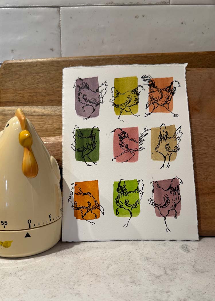 Each piece from the Chicken Scratch Collection is hand-painted with watercolor or gouache on cold pressed watercolor paper. Paper sizes are approximate, as each piece is either hand-torn or hand-cut. Imperfect in the best way—just like the farm that inspired them.